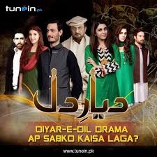 Diyar-e-Dil (Urdu: دیار دل ; lit. 'The Valley of the Heart') (also known as Dayar-e-Dil) is a Pakistani television drama serial, that originally aired on the Hum TV from 17 March 2015 to 27 October 2015, consisting of a total of 33 episodes.[3][4][5] Diyar-e-Dil follows the lives of a dysfunctional family led by Agha Jaan and his grandchildren, Wali and Farah. The story is told in a heavily serialized manner.
